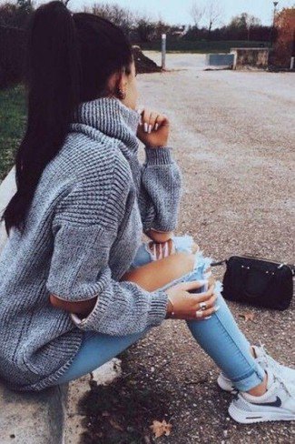 - Knit + jeans + statement shoe